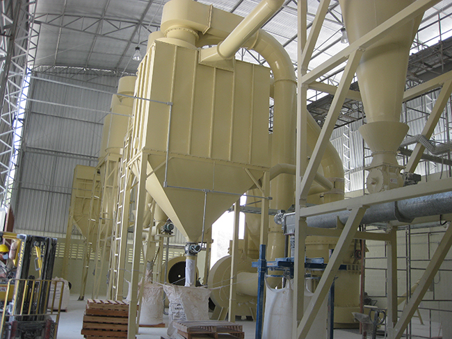 形狀較大的陶土首先由破碎設(shè)備破碎成陶土磨粉機(jī)所需粒度,斗式提升機(jī)負(fù)責(zé)將經(jīng)過(guò)破碎加工的陶土送入儲(chǔ)料斗,之后使用振動(dòng)給料機(jī)將儲(chǔ)料斗內(nèi)的物料送進(jìn)陶土磨粉機(jī)主機(jī)磨室內(nèi),經(jīng)過(guò)磨輥與磨環(huán)的相互作用實(shí)現(xiàn)物料的破碎,粉磨完成后,經(jīng)過(guò)粉磨的物料粉子在鼓風(fēng)機(jī)的作用下進(jìn)入選粉機(jī),選粉機(jī)選出符合粒度要求的陶土物料,進(jìn)入成品收集器內(nèi),不符合要求的陶土物料重新返回磨室內(nèi)進(jìn)行磨粉加工。