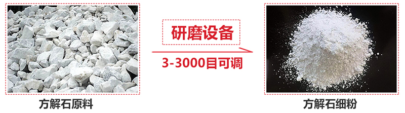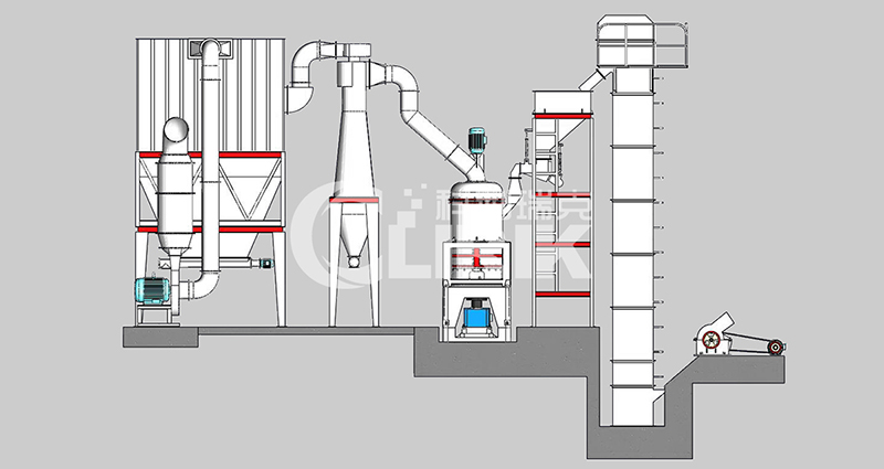 我們把方解石大塊物料經(jīng)破碎機(jī)破碎到能進(jìn)入磨粉機(jī)的入料細(xì)度(15mm-50mm),經(jīng)過破碎后的方解石小塊物料經(jīng)提升機(jī)送至料倉(cāng),再經(jīng)振動(dòng)給料機(jī)將其均勻定量的送入磨機(jī)研磨室內(nèi)進(jìn)行研磨。